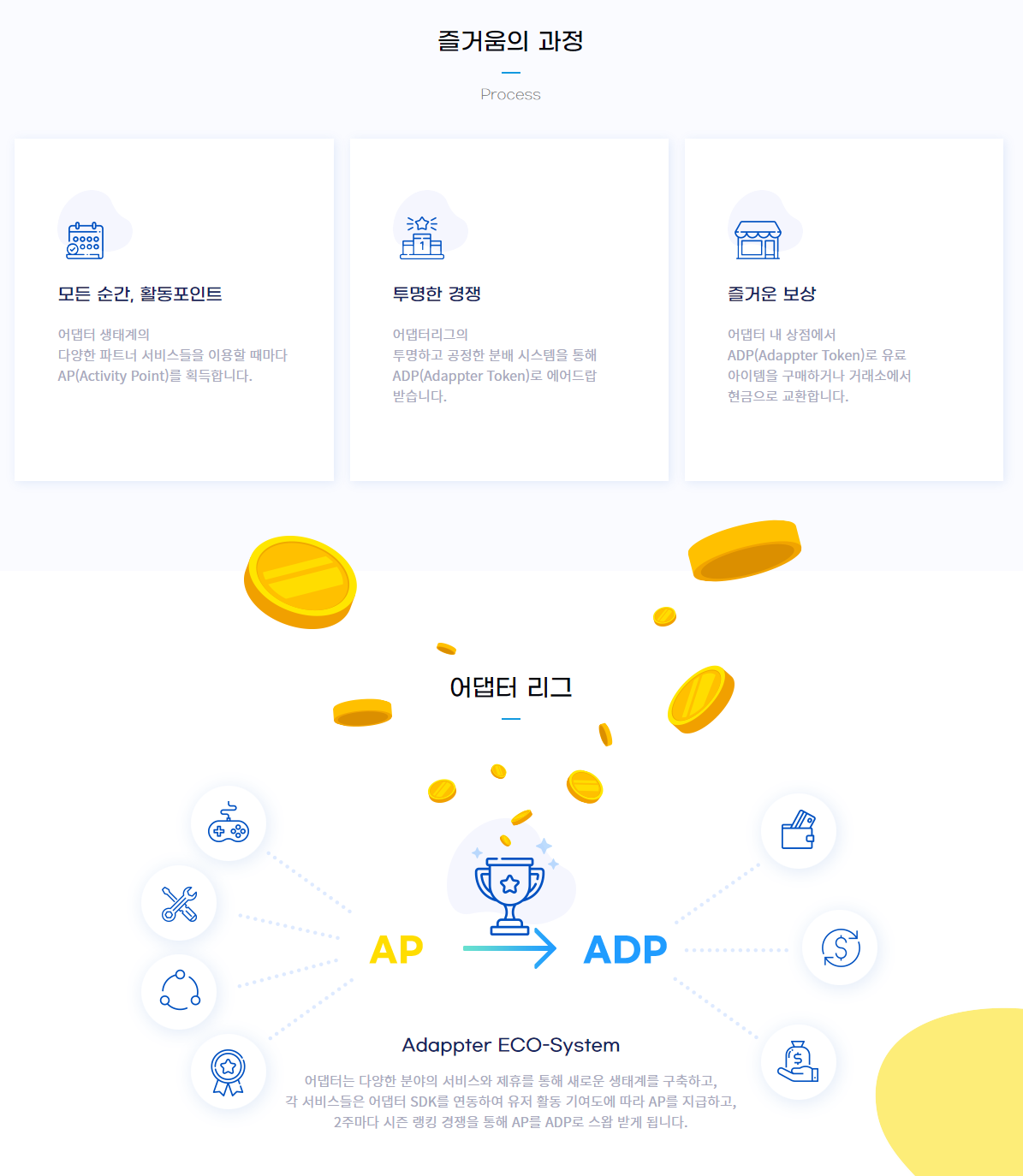 각종 앱에 추가로 연동하여 어댑터 sdk가 재공 하는 기능을 이용하게 하여 AP(일종의 포인트)를 획득하게 하여 이득을 유도하는 시스템 같네요. 이후 이 포인트 관련하여 ADP가 에어드롭이 우리 어지고, 그것으로 유료 아이템을 구매하거나, 거래소에서 거래를 하거나 하는 선순환이 목표점인듯합니다.
