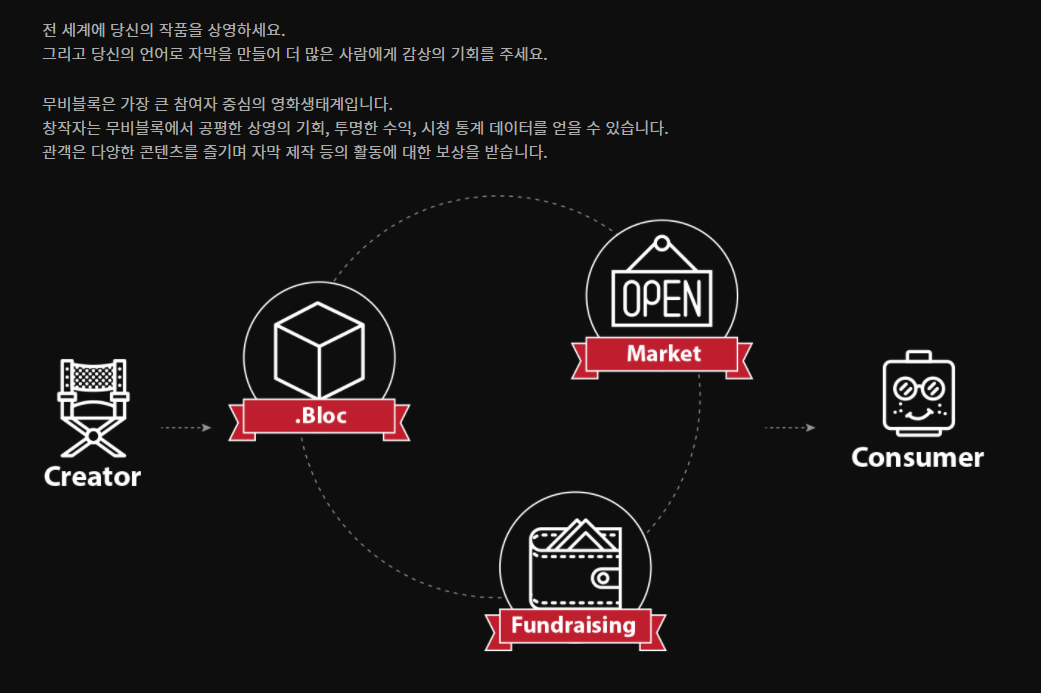 무비 블록 생태계는 커뮤니티, 마켓, 그리고 펀드레이징 3가지 Layer로 구성됩니다. BLOC는 탈중앙화된 영화 커뮤니티로 무비블록 생태계 내 모든 참여자를 연결해줍니다. 마켓 Layer는 제작된 영화가 판매, 큐레이션되며 번역과 홍보, 디자인 등을 거래하는 기능을 합니다. 그리고 마켓 사용자는 유료로 판매되는 TVOD와 광고를 기반한 무료로 시청가능한 AVOD로 영화를 볼 수 있습니다. 펀드레이징 Layer는 무비블록 생태계에서 개최되는 영화제와 후원 등으로 창작자가 양질의 콘텐츠를 생산 및 업로드할 수 있는 동기를 부여합니다.
