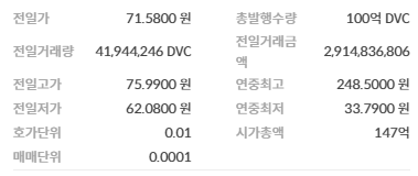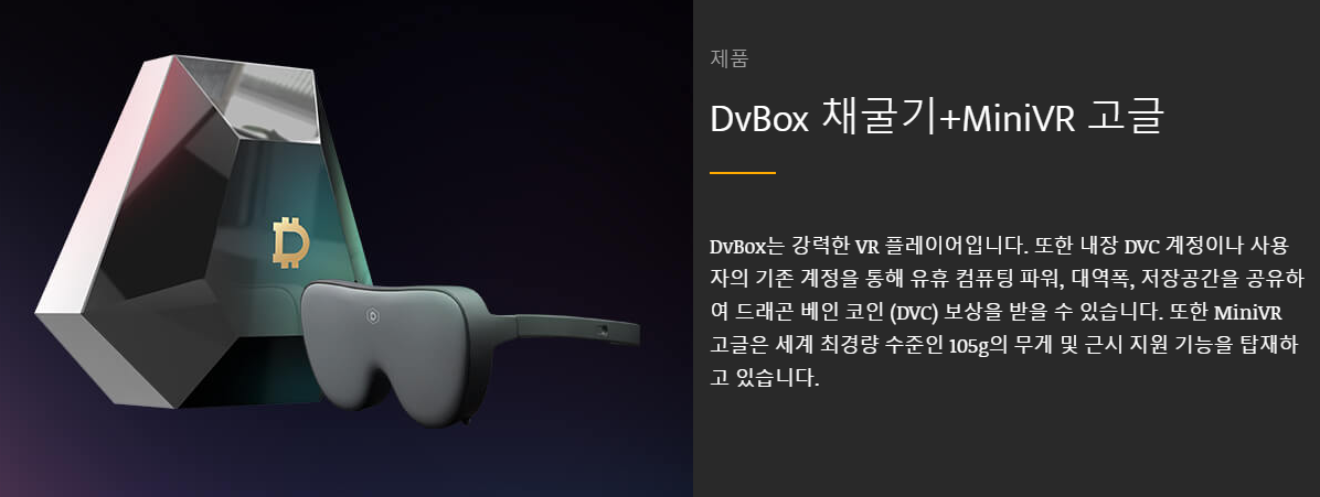 드래곤베인은 가상현실 렌더링, 디스플레이 장비, 하드웨어 및 소프트 웨어 제품군 등을 기반으로 사용자들이 가상현실을 쉽게 경험할 수 있도록 진입장벽을 크게 낮추고 컨텐츠 제작자들의 이익이 보호될 수 있도록 설계된 플랫폼입니다. 이때, DVC는 가상현실 디지털 권한 관리 및 생태계 내 컨텐츠 거래, 임대, 구매 등에 사용하는 가상자산입니다.